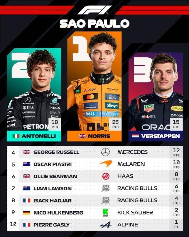 F1圣保罗站正赛,诺里斯夺冠!安东内利亚军刷新生涯最佳,维斯塔潘从维修区发车,最终第3登上领奖台。圣保罗站前10: